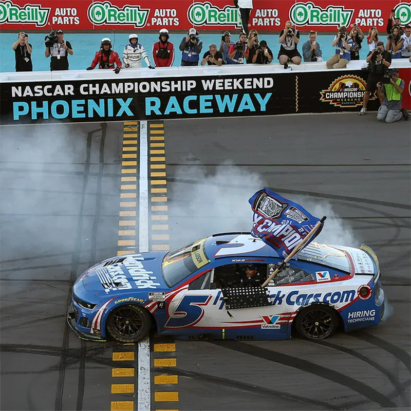 Officially licensed one sided Kyle Larson 2025 NASCAR Cup Series Champion On-Track Victory 3' x 5' flag with grommets. It features long lasting color-fast colorful dye with graphics that show through to the backside. The attached grommets let you fly on a flagpole or hang it on a wall. Officially Licensed. Manufacturer: Wincraft